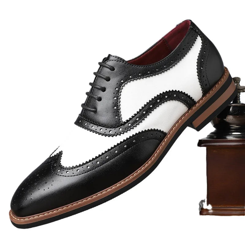 Make a statement with the Sterling Two-Tone Brogues, a bold blend of classic design and modern flair. Crafted in black-and-white leather, these lace-up shoes feature timeless brogue detailing that adds polish to any formal look. Built for weddings, proms, and special occasions, they’re as sharp as they are versatile — dress them up with a suit or pair them with tailored trousers for an unforgettable style.